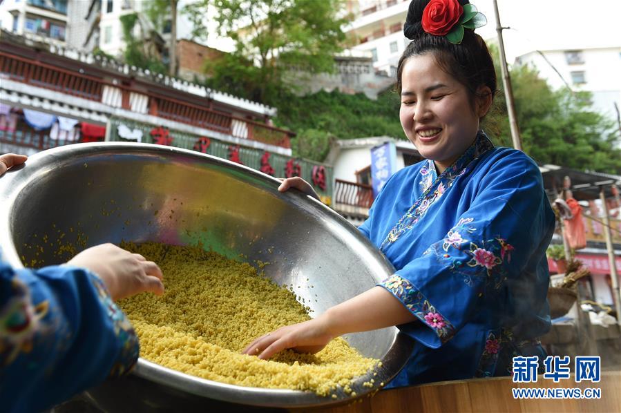 4月16日,在貴州省臺江縣姊妹街哆蝶五彩姊妹飯體驗店,苗家婦女在制作五彩“姊妹飯”。新華社發(fā)(劉開福攝)