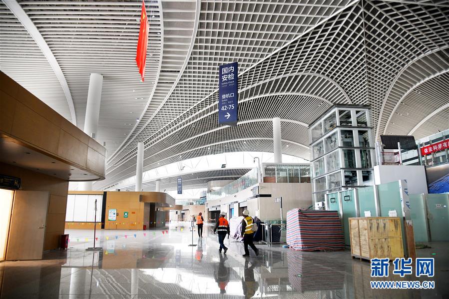 3月25日,兩名工人從建設(shè)中的青島膠東國際機(jī)場(chǎng)航站樓出發(fā)大廳走過。新華社記者李紫恒攝