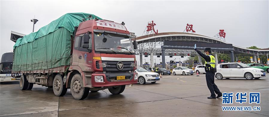 3月24日,在武漢西高速收費(fèi)站交通卡點(diǎn),執(zhí)勤民警準(zhǔn)備檢查車輛。新華社記者才揚(yáng)攝