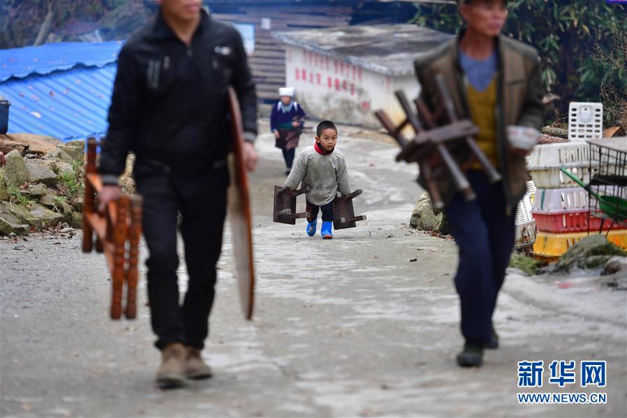 烏英苗寨一名小朋友跟隨大人,帶小板凳前來(lái)參加百家宴,慶祝新蘆笙柱豎立(12月22日攝)。新華社記者黃孝邦攝