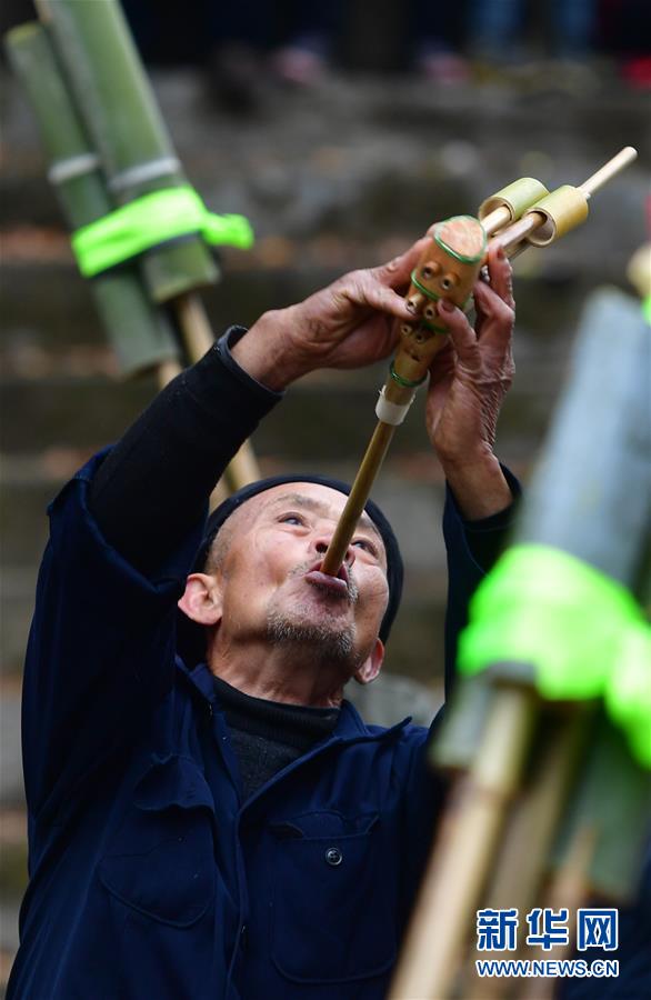 在烏英苗寨新蘆笙柱下,融水苗族自治縣苗族蘆笙音樂(lè)代表性傳承人梁安合(中)在練習(xí)吹蘆笙(12月24日攝)。新華社記者王諾攝
