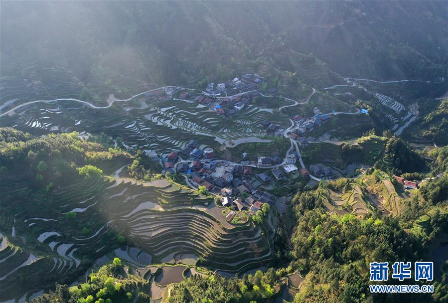 這是融水苗族自治縣桿洞鄉(xiāng)小河村高羽苗寨的木樓和梯田(3月31日攝,無(wú)人機(jī)照片)。新華社記者黃孝邦攝