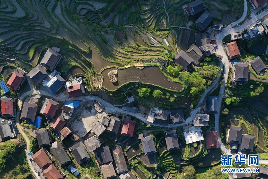 這是融水苗族自治縣桿洞鄉(xiāng)小河村高羽苗寨的木樓和梯田(3月31日攝,無(wú)人機(jī)照片)。新華社記者黃孝邦攝