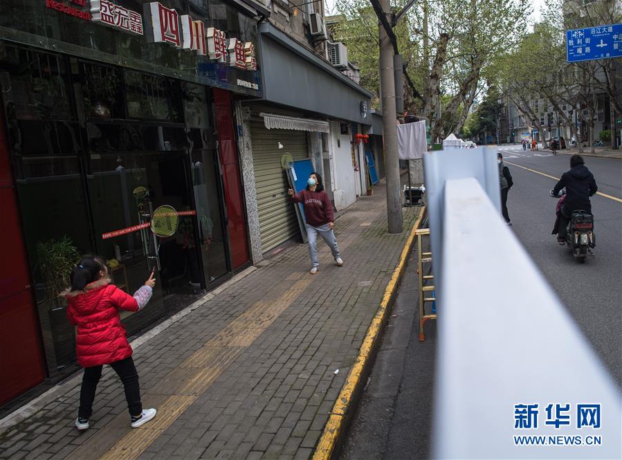 4月1日,在一元路上,人們在一家店鋪前打羽毛球。新華社記者肖藝九攝