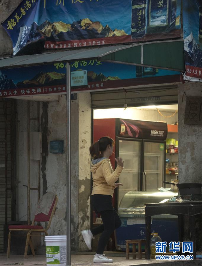 3月25日晚,武漢市民在街邊的便利店前跳健身操。新華社記者費茂華攝