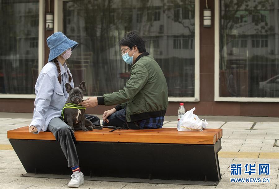 4月1日,兩人在路邊聊天逗狗。新華社記者費茂華攝