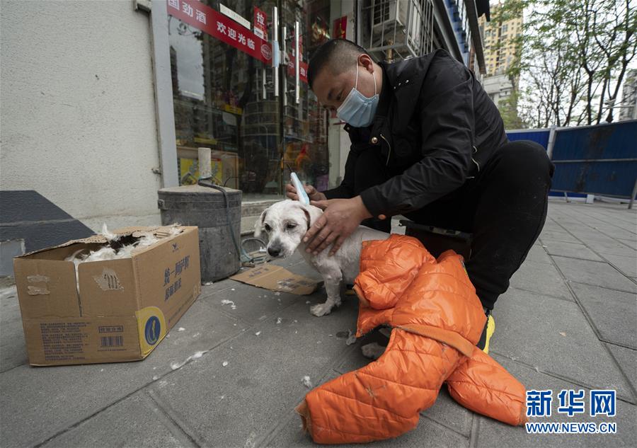 4月1日,一位市民在中山大道路邊給寵物剃毛,準(zhǔn)備迎接夏天。新華社記者費茂華攝