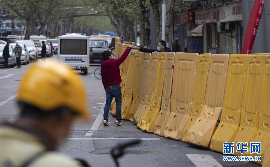 4月1日,在前進(jìn)二路,人們隔著隔離墻遞送食品。新華社記者費茂華攝
