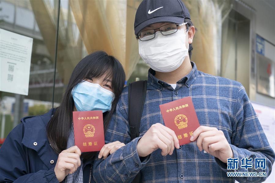 4月7日,在武漢市江岸區(qū)民政局婚姻登記處,新人盧先生和丁女士展示結(jié)婚證。 新華社記者才揚(yáng)攝