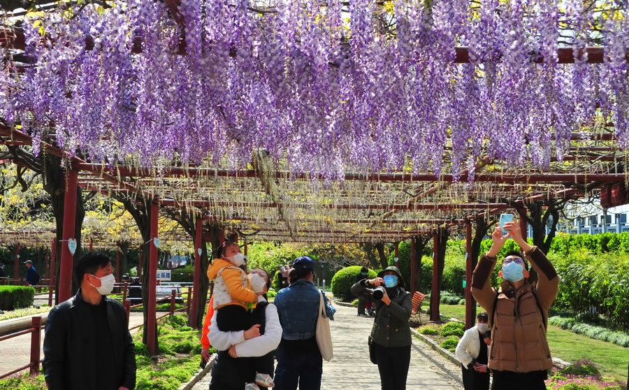 2020年4月5日,上海,每年的4月上旬至5月初是觀賞紫藤花的最佳時(shí)期。清明小長(zhǎng)假里,晴好天氣使嘉定紫藤園迎來(lái)了不少市民游客。今年的紫藤公園采取提前預(yù)約和亮相綠色隨申碼的舉措入園賞花。公園擁有26個(gè)品種的紫藤花,盛開(kāi)時(shí)期的紫藤花穗最長(zhǎng)可達(dá)1米多?;ㄉ凶希?,白等,形成的花瀑宛若一簾幽夢(mèng),雅致春意今人流連忘返。