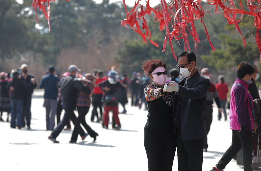 2020年4月6日,遼寧沈陽(yáng),北陵公園在清明小長(zhǎng)假的最后一天,游客猛增。市民對(duì)各項(xiàng)游戲都踴躍參與。圖為伴著歡快優(yōu)美的樂曲,大爺大媽們紛紛起舞。