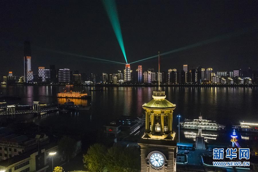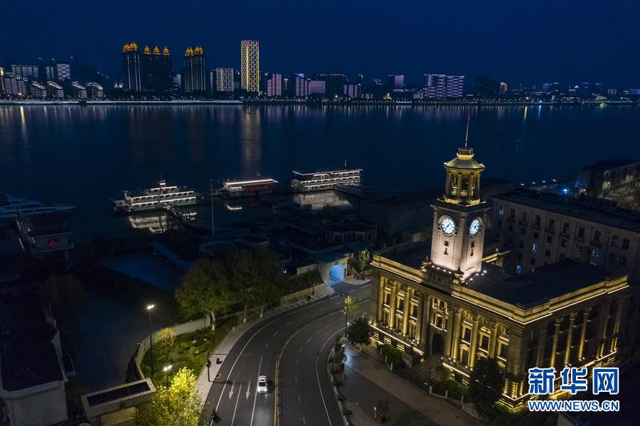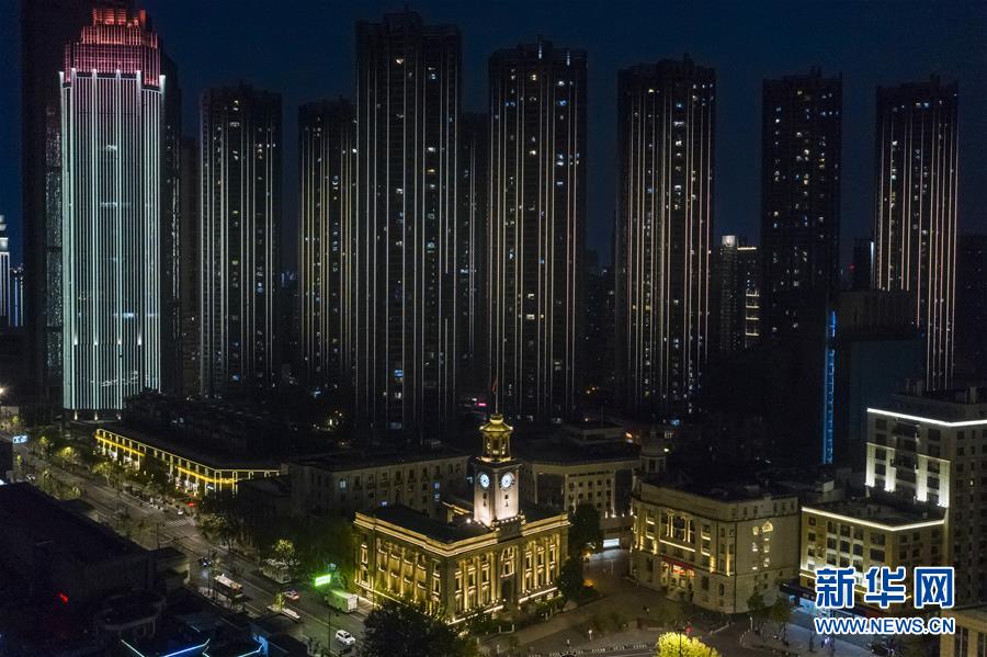 這是4月7日晚拍攝的武漢市江漢關(guān)博物館附近的長江兩岸建筑燈光夜景(無人機拍攝)。4月8日零時起,武漢市正式解除離漢離鄂通道管控措施。新華社記者沈伯韓攝