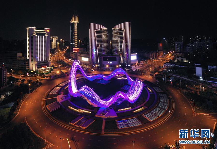 4月7日,武漢光谷環(huán)島開啟燈光秀(無人機照片)。當日,隨著武漢解除離漢通道管控進入倒計時,全市開啟了城市景觀照明,夜色中的武漢美不勝收。新華社記者李賀攝