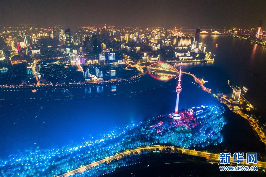4月8日零時起,武漢市正式解除離漢離鄂通道管控措施,全市景觀照明開啟(無人機拍攝)。新華社記者程敏攝