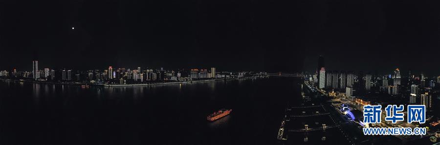 這是4月7日晚拍攝的武漢市江漢關(guān)博物館附近的長(zhǎng)江兩岸建筑燈光夜景(無(wú)人機(jī)拍攝)。新華社記者沈伯韓攝