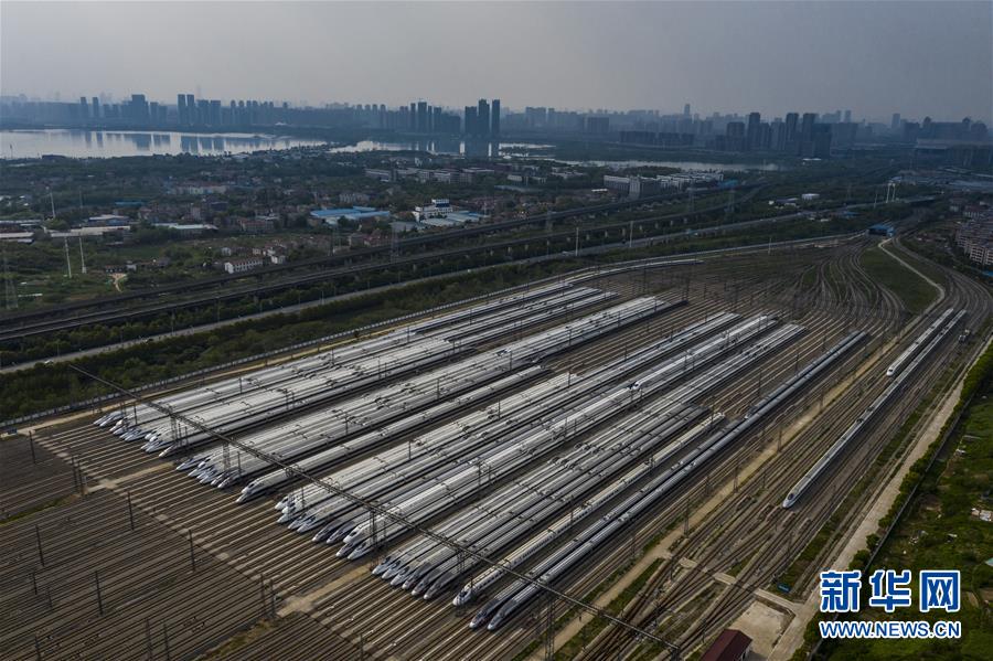 4月7日,在武漢動(dòng)車段,列車??吭诖孳嚲€上(無人機(jī)照片)。新華社記者 沈伯韓 攝