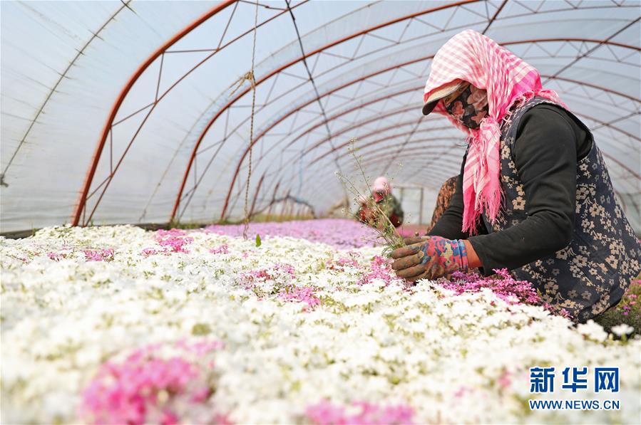 4月13日,在八角臺(tái)街道雅化村花圃內(nèi),花農(nóng)為培育的宿根花卉除草。新華社記者姚劍鋒攝