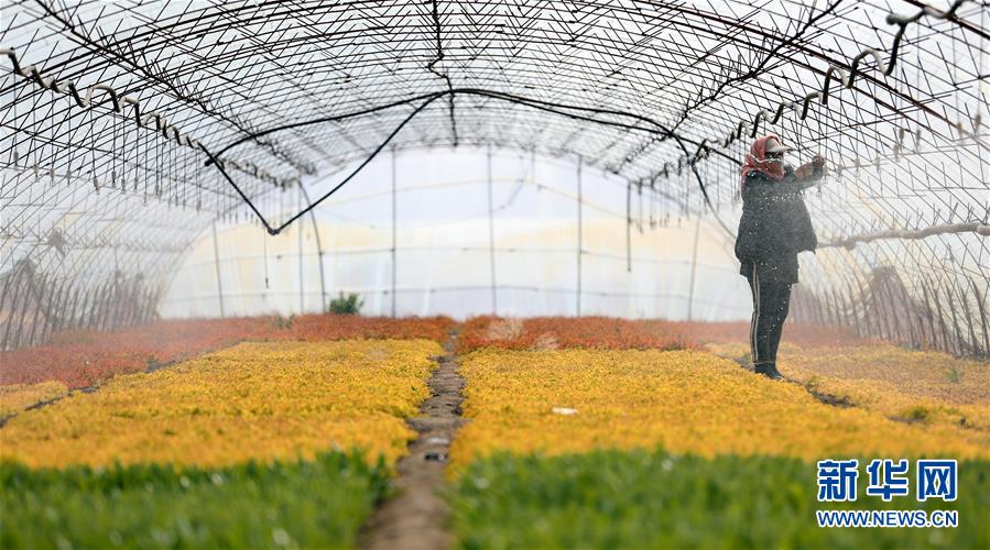 4月13日,在八角臺街道雅化村花圃內,花農苗景香修理噴淋器。新華社記者姚劍鋒攝