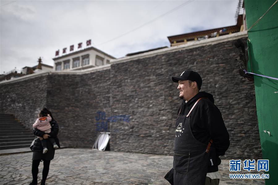 4月10日,才仁俄賽在餐廳門口和朋友聊天。新華社記者吳剛攝