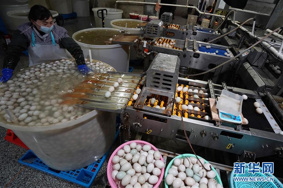 在江蘇高郵鴨集團生產車間,腌制好的鴨蛋準備進行清洗包裝作業(yè)(4月15日攝)?!案哙]鴨蛋”是江蘇高郵的特色農業(yè)名片。近年來,當?shù)卦诹挤N繁育、生態(tài)養(yǎng)殖、產品加工等方面加大力度,推動高郵鴨蛋品牌化建設,讓小鴨蛋成為帶動農戶致富的大產業(yè)。2019年,高郵市共計生產熟制鴨蛋產品近11.2億枚,年產值近17.68億元。新華社記者李博攝