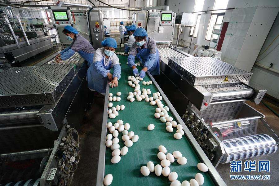 4月15日,在江蘇高郵鴨集團,工人在生產線上忙碌?!案哙]鴨蛋”是江蘇高郵的特色農業(yè)名片。近年來,當?shù)卦诹挤N繁育、生態(tài)養(yǎng)殖、產品加工等方面加大力度,推動高郵鴨蛋品牌化建設,讓小鴨蛋成為帶動農戶致富的大產業(yè)。2019年,高郵市共計生產熟制鴨蛋產品近11.2億枚,年產值近17.68億元。新華社記者季春鵬攝