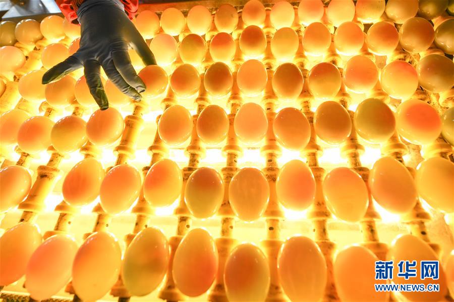 江蘇高郵鴨集團的工作人員在生產線上對鴨蛋進行光檢作業(yè)(4月15日攝)?!案哙]鴨蛋”是江蘇高郵的特色農業(yè)名片。近年來,當?shù)卦诹挤N繁育、生態(tài)養(yǎng)殖、產品加工等方面加大力度,推動高郵鴨蛋品牌化建設,讓小鴨蛋成為帶動農戶致富的大產業(yè)。2019年,高郵市共計生產熟制鴨蛋產品近11.2億枚,年產值近17.68億元。新華社記者李博攝