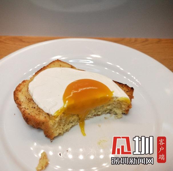 看起來(lái)像是土司蛋糕上的荷包蛋。但其實(shí)是烤檸檬海綿蛋糕,香草奶油制作的蛋清以及芒果泥制作的蛋黃。