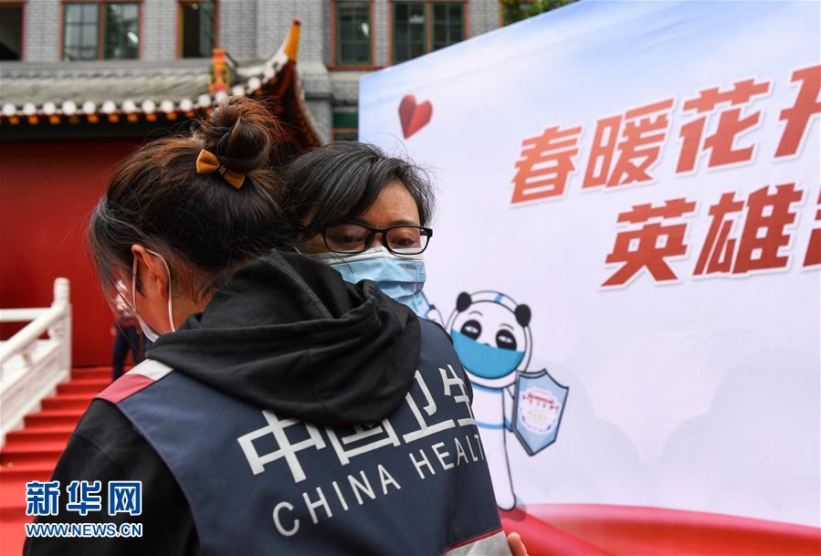 4月21日,在四川大學華西醫(yī)院,醫(yī)療隊隊員相互擁抱。當日,來自四川大學華西醫(yī)院、華西第二醫(yī)院、華西第四醫(yī)院的醫(yī)療隊隊員解除隔離休整,與分別許久的家人、同事團聚,緊緊相擁。新華社記者王曦攝