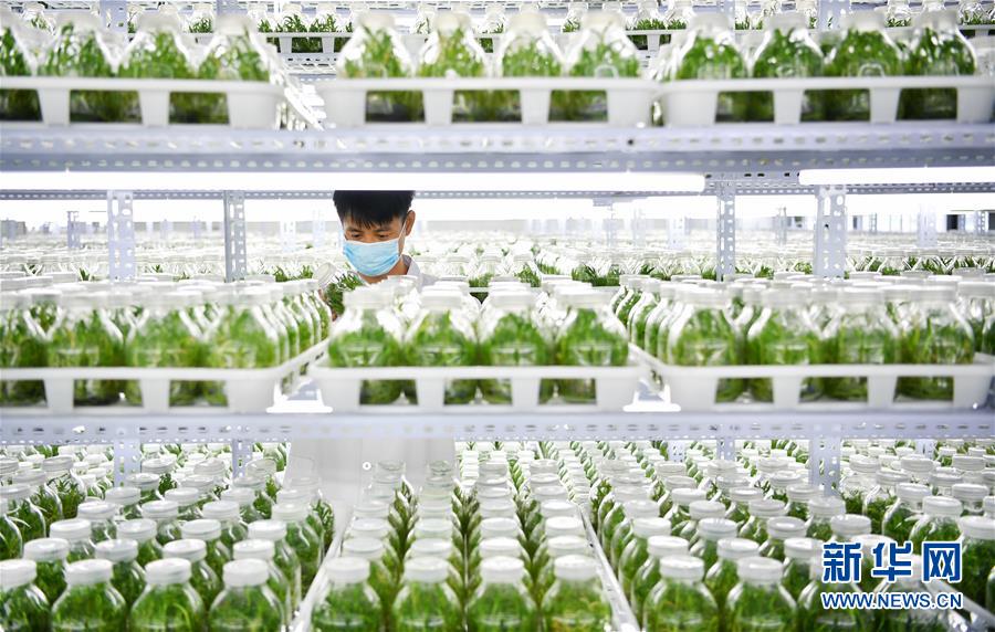4月21日,在位于施茶村的海南勝嶸生物科技有限公司石斛育種培養(yǎng)室內(nèi),工作人員在進(jìn)行石斛育種。新華社記者郭程攝