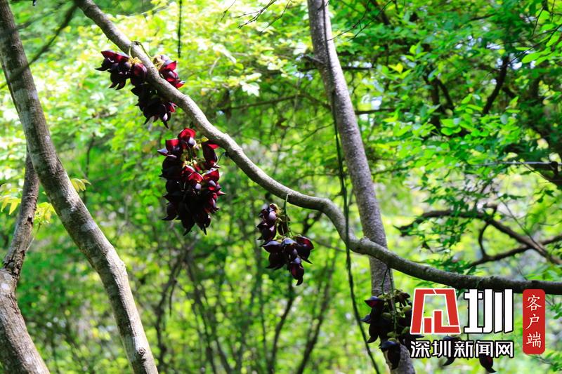 禾雀花序懸掛于悠長盤曲的老莖上,吊掛成串,每串二、三十朵,串串下垂。
