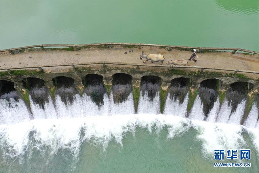 4月23日,在廣西隆安縣南圩鎮(zhèn),農(nóng)人趕著牲畜走過一座小橋(無人機照片)。新華社記者周華攝