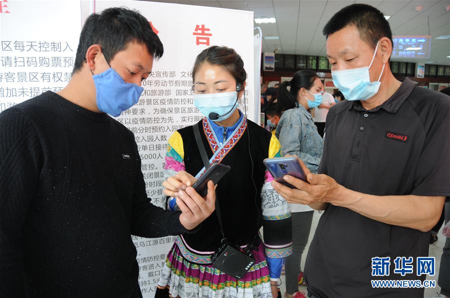 4月30日,織金洞景區(qū)工作人員(中)在給游客講解線上購票方法。“五一”小長假將至,位于貴州省織金縣的世界地質(zhì)公園織金洞景區(qū)迎來各地游客。據(jù)了解,該景區(qū)實(shí)行分時(shí)段預(yù)約和人數(shù)限流措施,確保游客安全有序游覽。新華社記者 李黔渝 攝
