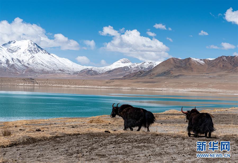 4月30日,兩只牦牛在當穹錯湖畔。當穹錯地處西藏那曲市尼瑪縣南部,湖面海拔4475米。暮春時節(jié),湖水碧藍清亮,讓人仿佛置身仙境。新華社記者侯捷攝