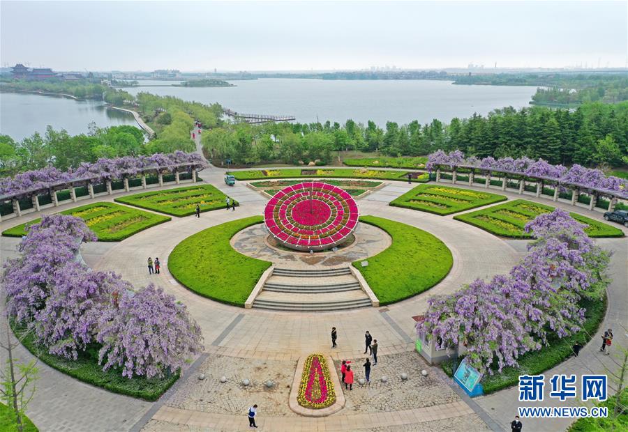 5月2日,游人在位于山東青島膠州市的青島大沽河省級(jí)生態(tài)旅游度假區(qū)賞花游玩(無(wú)人機(jī)照片)?!拔逡弧奔偃掌陂g,人們以多種方式放松心情、享受假日。新華社發(fā)(王昭脈攝)