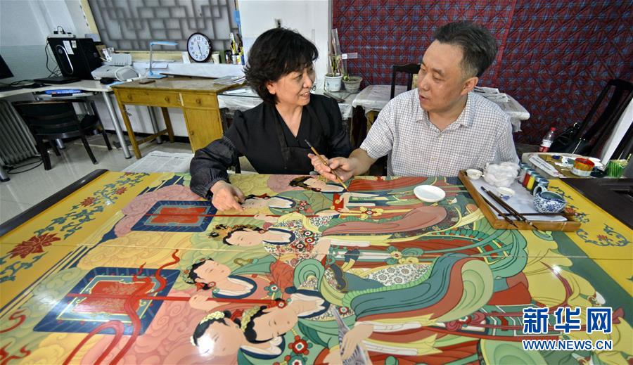 5月4日,屏風(fēng)設(shè)計(jì)人、國家級(jí)非物質(zhì)文化遺產(chǎn)“金漆鑲嵌髹飾技藝”代表性傳承人柏群(右)和領(lǐng)銜主創(chuàng)的工藝美術(shù)大師胡昕進(jìn)行屏風(fēng)畫面的最后檢視。新華社記者 李欣 攝