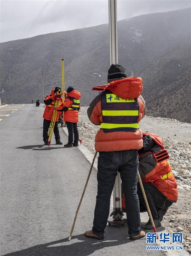 國測一大隊隊員在西藏定日縣曲當鄉(xiāng)境內(nèi)進行水準測量(4月18日攝)。水準測量是一種利用提供水平視線的儀器(如水準儀、水準標尺),測定地面不同點之間的高差,并以此推算高度的一種方法,是經(jīng)典大地測量的重要技術(shù)之一。在目前正在進行的2020珠峰高程測量中,部分國測一大隊隊員承擔了水準測量的任務(wù)。新華社記者晉美多吉攝