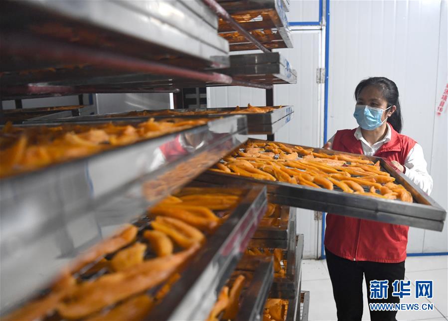 唐莉在平樂縣張家鎮(zhèn)老埠村合作社查看紅薯干生產(chǎn)情況(5月4日攝)。新華社記者周華攝