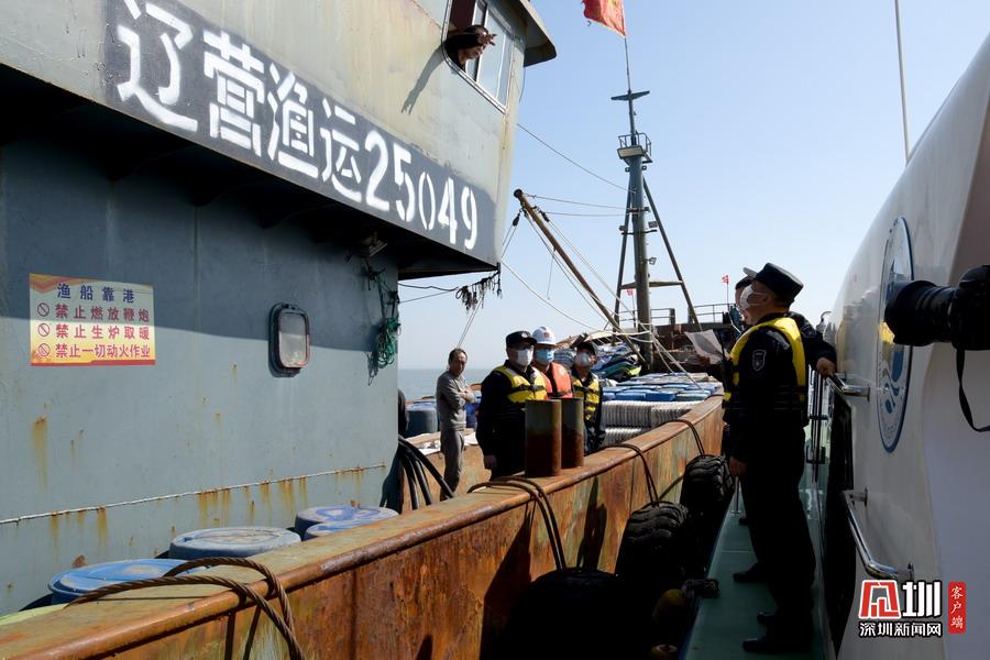 2020年5月6日,山東省榮成市石島管理區(qū)石島灣海域,榮成市漁政部門(mén)執(zhí)法人員對(duì)一運(yùn)輸船進(jìn)行檢查。