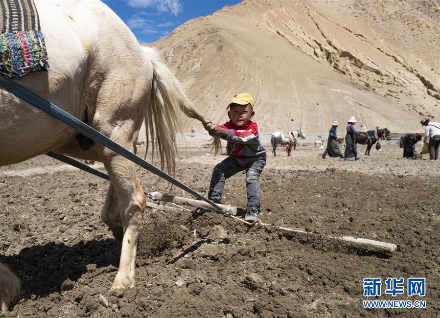 5月4日在西藏扎西宗鄉(xiāng)拍攝的小旦多。受疫情影響,他所在的幼兒園還未復課,他便到田里幫父親犁地。新華社記者普布扎西攝