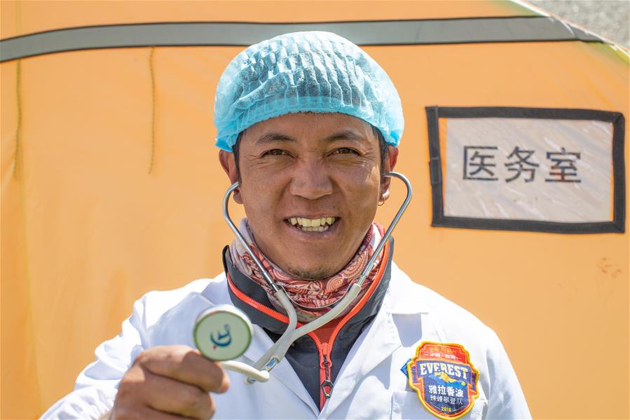 高山醫(yī)生阿旺羅布在珠峰大本營(yíng)(5月8日攝)。5月8日是世界微笑日。在海拔5200米的珠峰大本營(yíng),參與2020珠峰高程測(cè)量的各方人員,微笑期待本次測(cè)量活動(dòng)的圓滿成功。