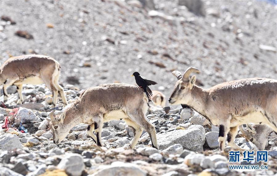一只黃嘴山鴉停留在巖羊身上(5月8日攝)。當(dāng)日,一群巖羊在珠峰大本營(yíng)周?chē)捠?,黃嘴山鴉飛到巖羊身上停留,構(gòu)成一幅幅生動(dòng)有趣的雪域圖畫(huà)。新華社記者晉美多吉攝
