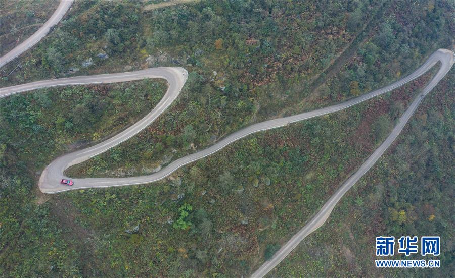 曾柱銘開(kāi)著自己的小轎車(chē)行進(jìn)在雷波縣箐口鄉(xiāng)厥箕村的山道上(2019年12月12日攝,無(wú)人機(jī)照片)。新華社記者江宏景攝