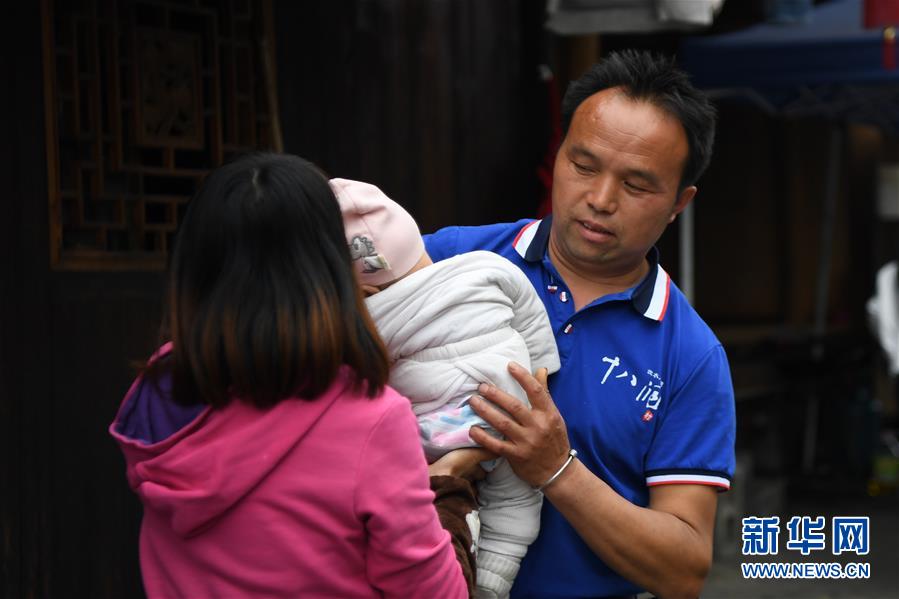 施六金(右)從妻子手中接過兒子施澤恩(4月25日攝)。1973年出生于十八洞村的施六金,由于父親患病很早就放棄學(xué)業(yè)和母親扛起了家庭的重擔(dān)。為了生活,他還曾遠去東南亞打工。2015年,看到家鄉(xiāng)的變化,施六金回到村里開起了農(nóng)家樂,年度家庭人均純收入也從2014年的1715元增長到了2019年的35696元。2018年,施六金與心愛的人組建了家庭。今年初,施六金與愛人迎來了一個大胖小子?!白鋈俗鍪乱没貓蠛透卸鳌!笔┝鸾o剛出生的兒子取名施澤恩。新華社記者薛宇舸攝