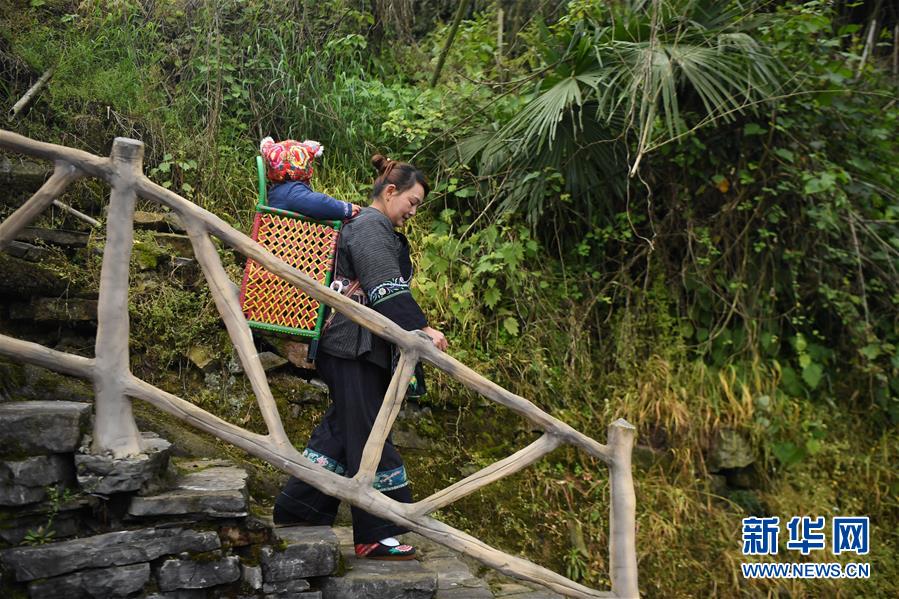 吳美金背著孫子走在十八洞村中,準(zhǔn)備前往村里的苗繡合作社(4月24日攝)。1967年出生的吳美金,1992年嫁入飛蟲村(現(xiàn)十八洞村飛蟲寨)時(shí),只有爛泥路的飛蟲村不僅田土少,掙錢活路也少,生活十分困難。2014年,吳美金加入了十八洞村苗繡特產(chǎn)農(nóng)民專業(yè)合作社,從小就會(huì)的苗繡傳統(tǒng)手藝如今成了家庭增收的法寶,不僅在家門口就把錢掙了,同時(shí)還能照顧年幼的孫子孫女?!艾F(xiàn)在的日子,比年輕的時(shí)候好多了?!眳敲澜鹫f。新華社記者薛宇舸攝