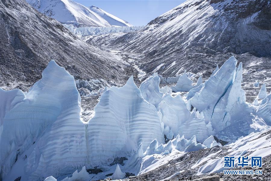 珠峰海拔5800米至海拔6500米的冰塔林(5月9日攝)。從海拔5800米的珠峰過渡營地到海拔6500米的前進(jìn)營地,冰塔林沿山谷排列,蔚為壯觀。新華社記者孫非攝