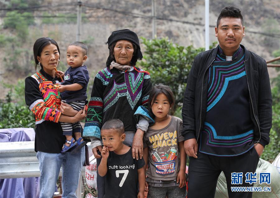 5月12日,四川省昭覺縣阿土列爾村第一批26戶貧困戶開始搬新家,莫色石波一家6口在山下公路邊合影留念。