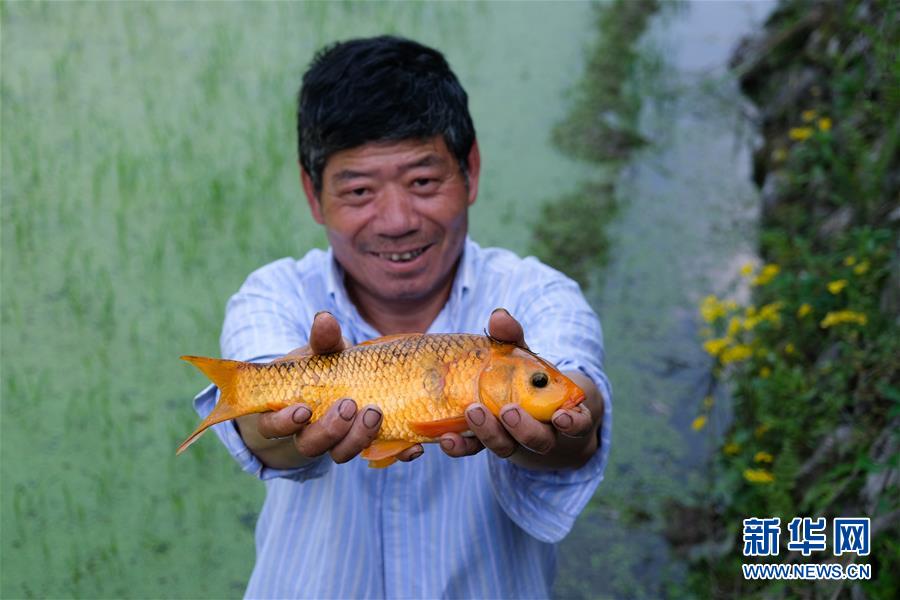 5月12日,青田縣巨浦鄉(xiāng)西坑村的村民展示梯田中放養(yǎng)的一條稻田魚。新華社記者徐昱攝