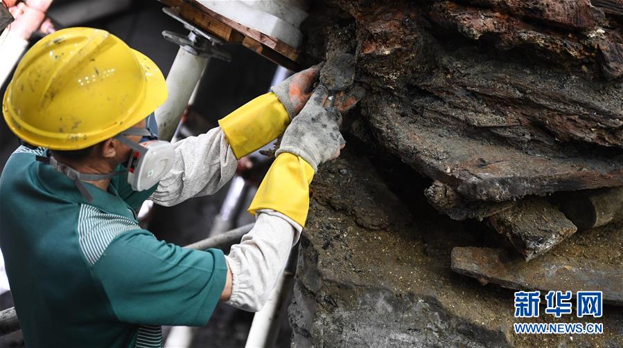 在廣東陽江海陵島,工作人員在“南海I號”發(fā)掘現(xiàn)場進行清理工作(5月12日攝)。新華社記者鄧華攝