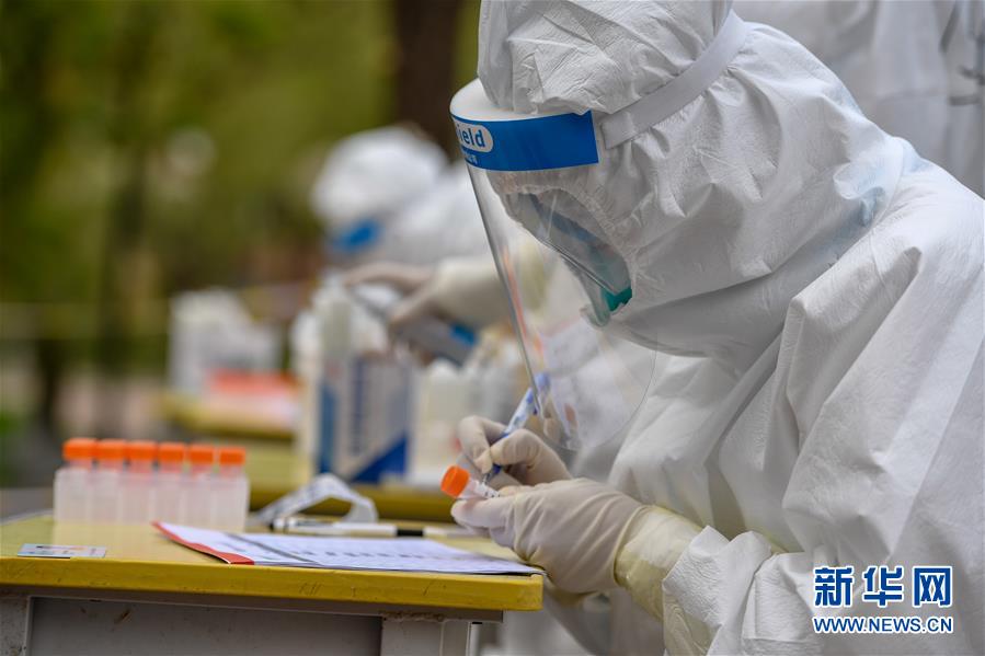 5月15日,在舒蘭市建馨園小區(qū),工作人員為居民進(jìn)行采樣、登記。當(dāng)日,從吉林市7家市直醫(yī)院抽調(diào)的300名護(hù)士經(jīng)培訓(xùn)后,全部投入到舒蘭市(隸屬于吉林市)核酸采樣工作中。為提供追溯傳染源所必需的核酸檢測(cè)相關(guān)數(shù)據(jù),舒蘭市根據(jù)確診病例的活動(dòng)軌跡,將流調(diào)和核酸檢測(cè)范圍擴(kuò)大至本地確診病例和無癥狀感染者的次密接人員及一般接觸者。新華社記者張楠攝