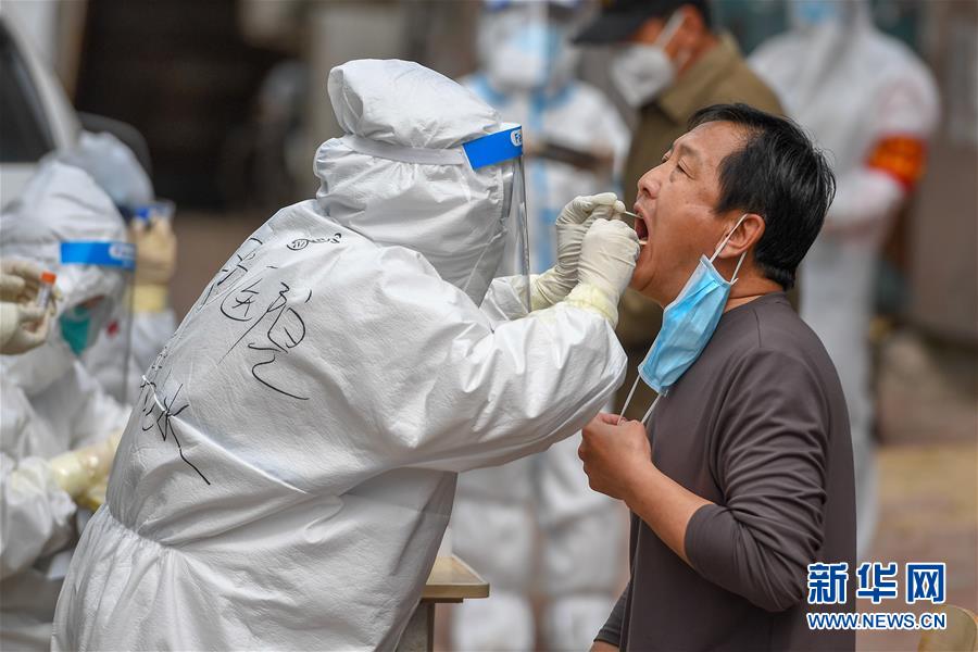 5月15日,在舒蘭市建馨園小區(qū),工作人員為居民采集咽拭子。當(dāng)日,從吉林市7家市直醫(yī)院抽調(diào)的300名護(hù)士經(jīng)培訓(xùn)后,全部投入到舒蘭市(隸屬于吉林市)核酸采樣工作中。為提供追溯傳染源所必需的核酸檢測(cè)相關(guān)數(shù)據(jù),舒蘭市根據(jù)確診病例的活動(dòng)軌跡,將流調(diào)和核酸檢測(cè)范圍擴(kuò)大至本地確診病例和無(wú)癥狀感染者的次密接人員及一般接觸者。新華社記者張楠攝